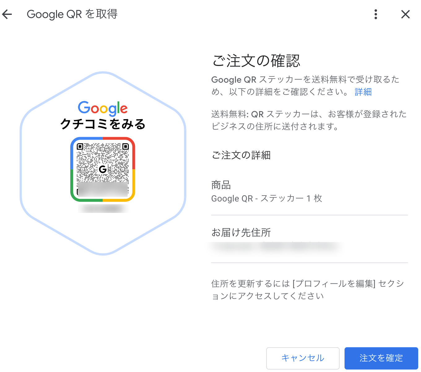 Google QRステッカーはビジネスにつき1枚無料で依頼することが出来ます。なお、手元で1枚注文した後に再度注文しようとしたところ、普通に注文出来てしまいそうなのですが、しばらくすると挙動が変わるのかもしれません。
