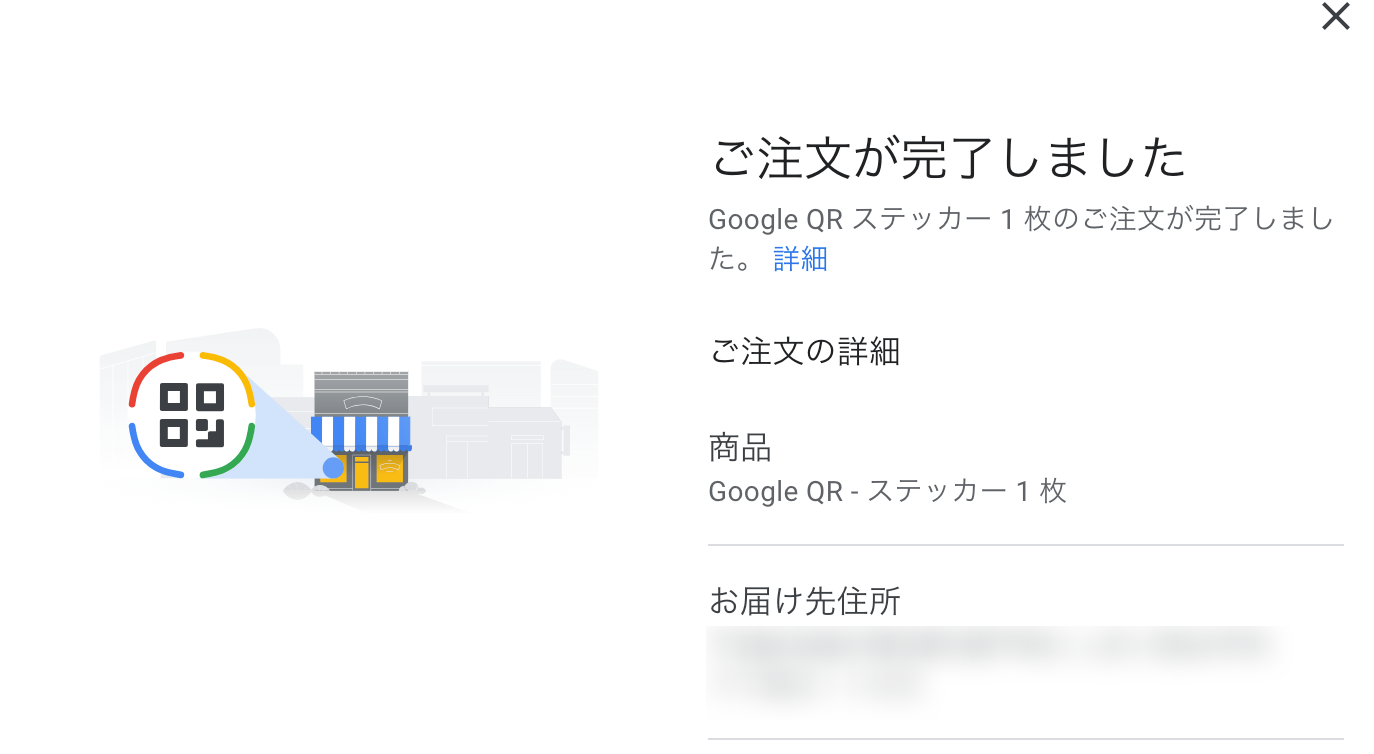 なお、注文が完了すると、このように可愛らしいアイコンで注文が完了したこと、発送先住所(ビジネスプロフィールの所在地)が記載された画面が表示されます。