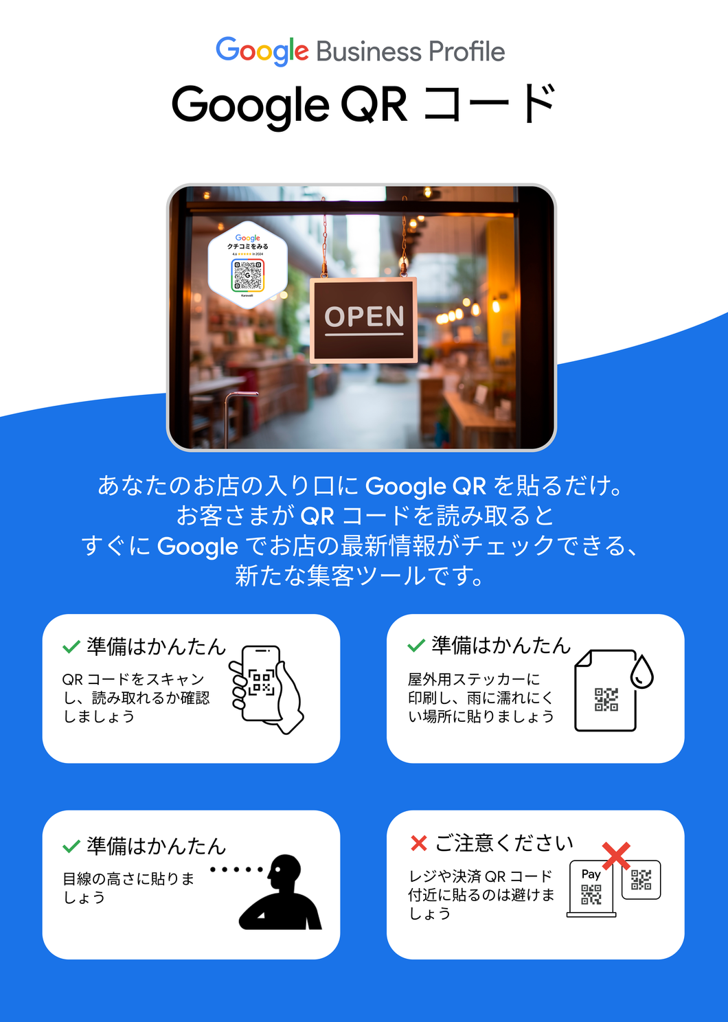 Google QRコードは店頭に掲示して使用するQRコードで、このQRコードを読み込んでもらうことでビジネスプロフィールに遷移してもらい、ユーザーに店舗情報を把握してもらったり、最新情報をチェックしてもらったりするために使用するものです。
