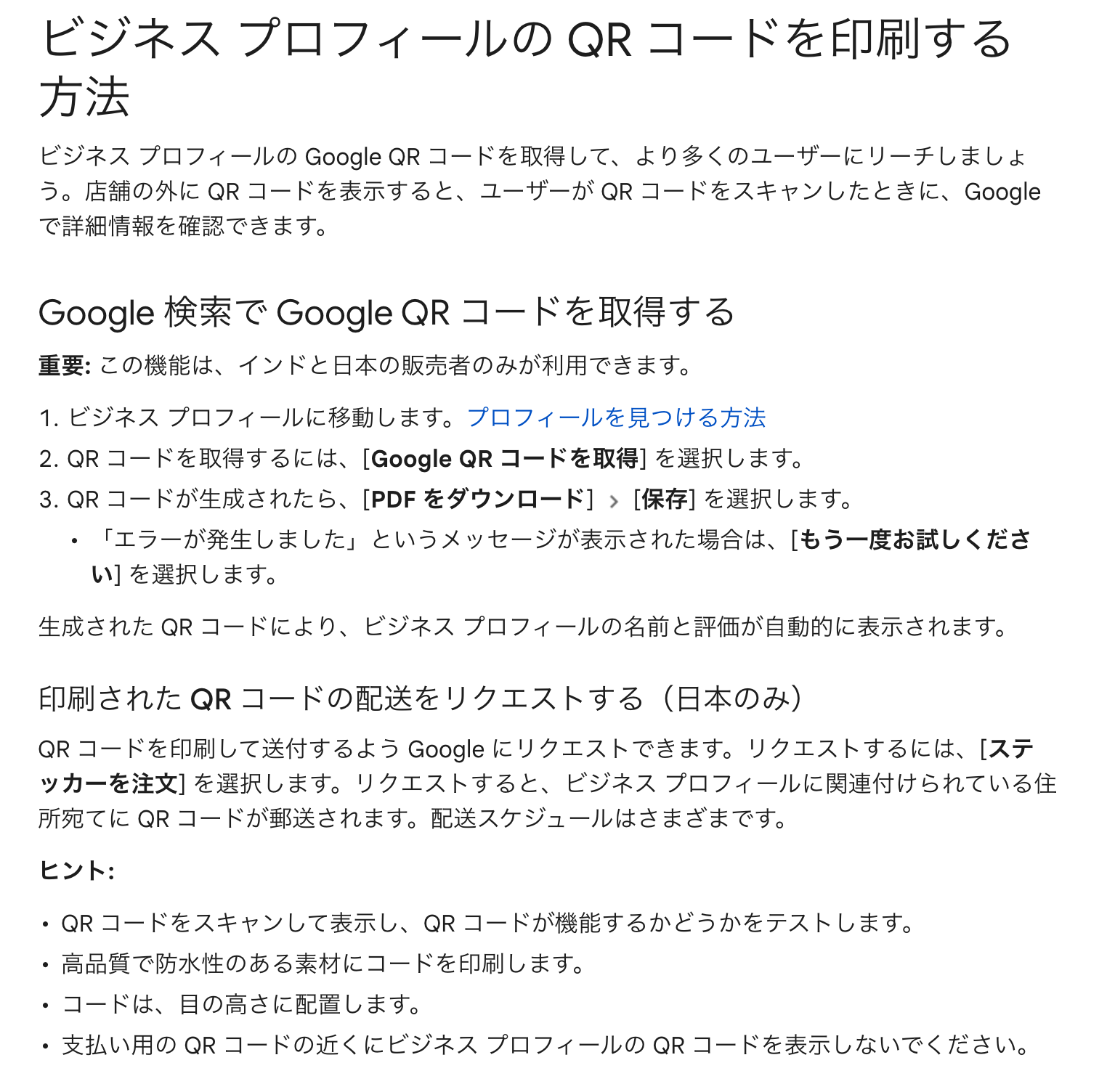 ビジネス プロフィールの QR コードを印刷する方法という名称でヘルプページも用意されています。ヘルプによると、Google QRコードという機能は、2025年10月時点では日本とインドのみの販売者が利用できる機能となっており、さらに印刷されたQRコードの配送のリクエストができるのは、なんと日本のみです!
