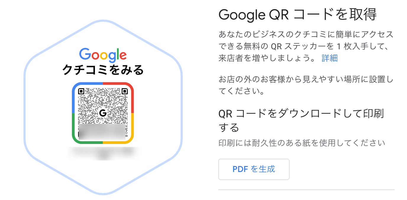 ビジネスプロフィールの管理画面にはボタンとしても、スライドできるカード状のパーツとしても表示されていますが、いずれかをクリックすると下記の画面へと遷移します。遷移した下記の画面では、Google QRコードをPDFとしてダウンロードして使用するか、Googleに対してQRステッカーを注文するかを選ぶことが出来ます。