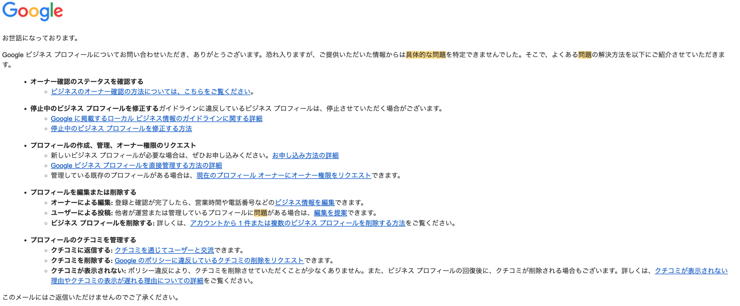 • 問い合わせを行う前にビジネスプロフィールの設定が、すべてガイドラインに従っていることを確認する