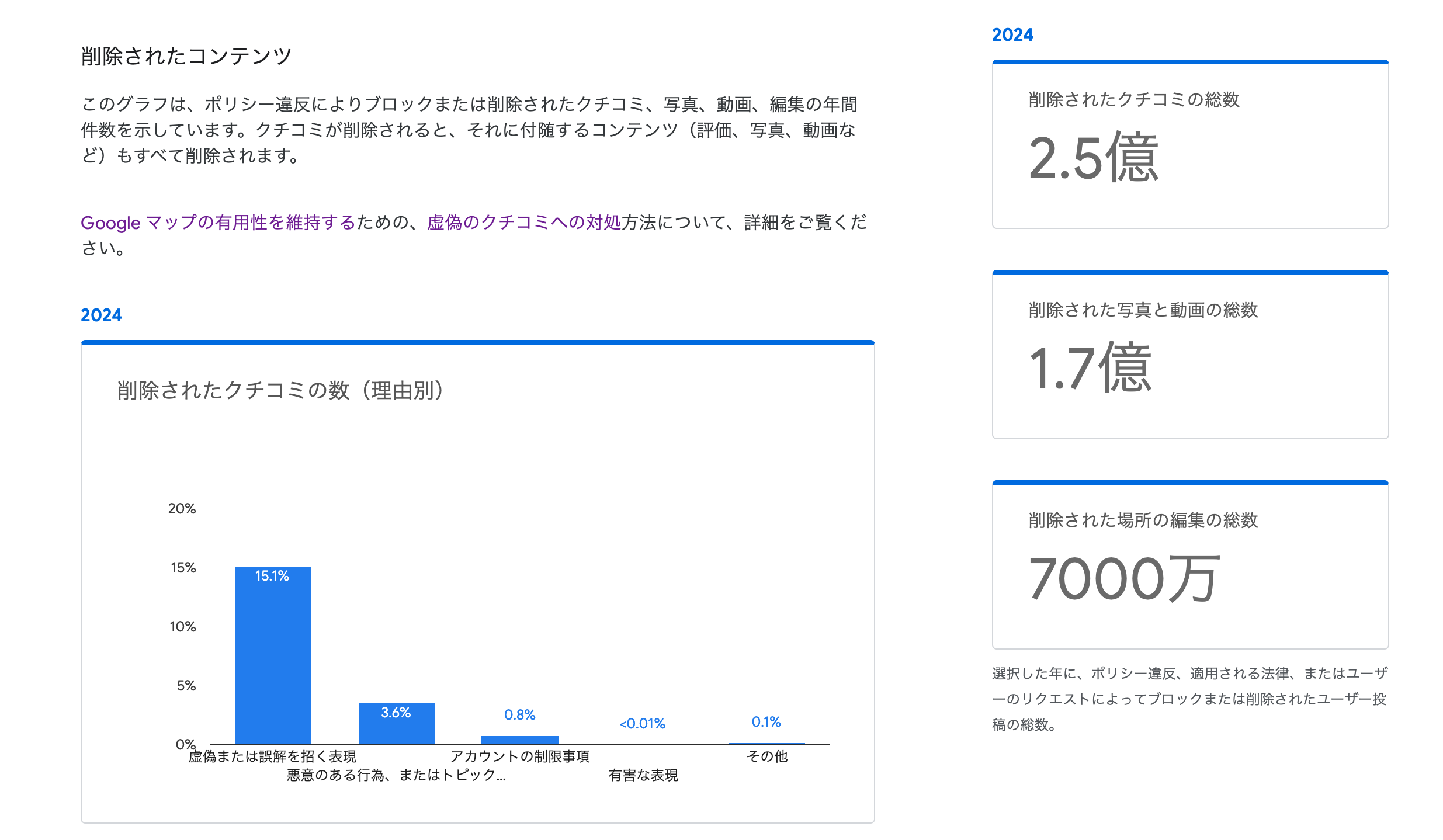 これらの観点で審査が行われた結果、虚偽のクチコミやポリシー違反のクチコミの大部分(85% 以上)は、実際に誰かが目にする前にブロックまたは削除されているそうです。また、透明性レポートによると、2024年には約2.5億件のクチコミがポリシー違反として削除されており、写真や動画についても1.7億件が削除されています。