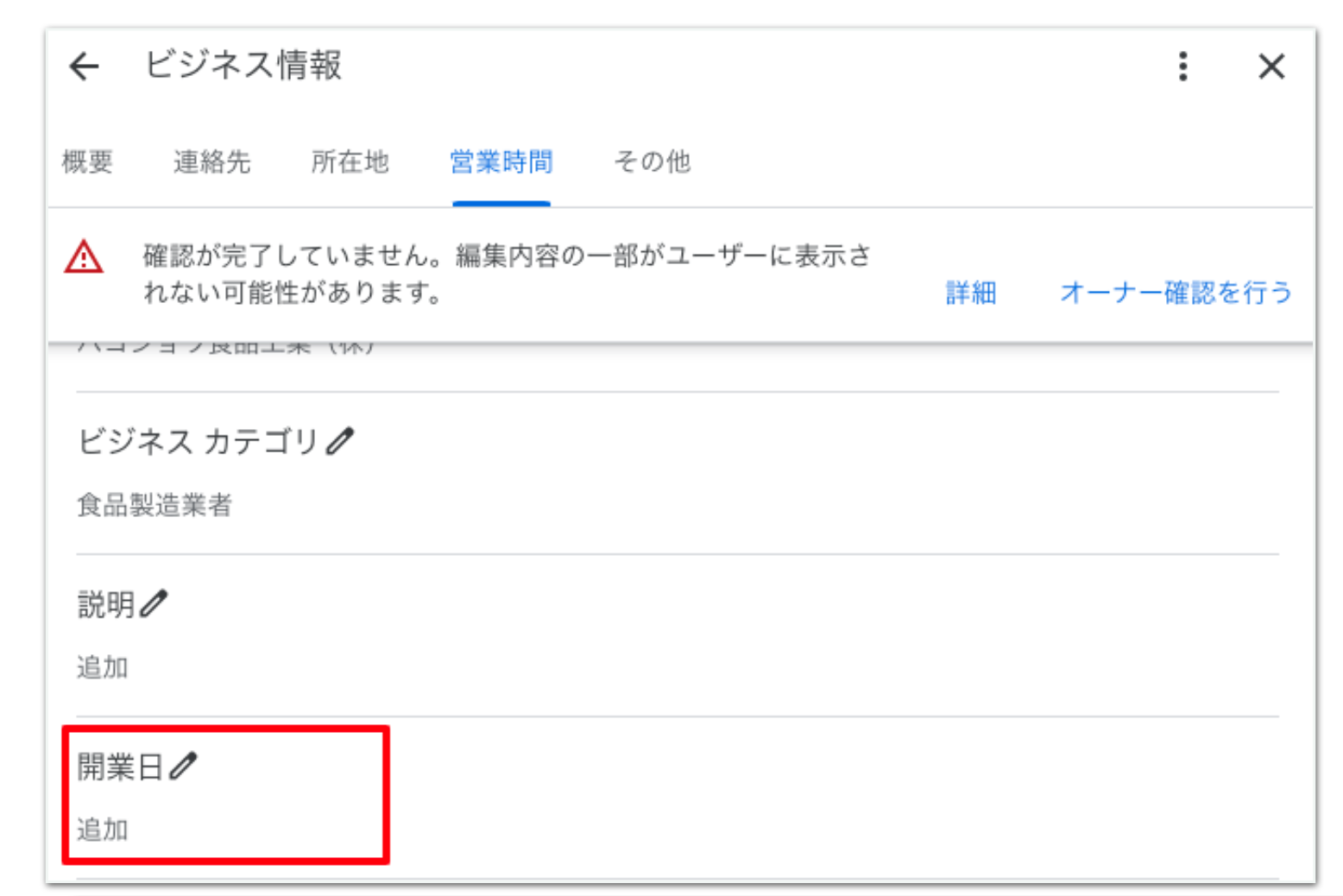 オーナー確認完了後に未来日の開業日を設定してしまうと、不正な挙動とみなされ、ビジネスプロフィールが即時停止されるリスクがあります。一度停止されるとビジネスプロフィールの復旧対応に時間がかかることも多く、開業直後の集客に大きな影響が出る可能性があります。