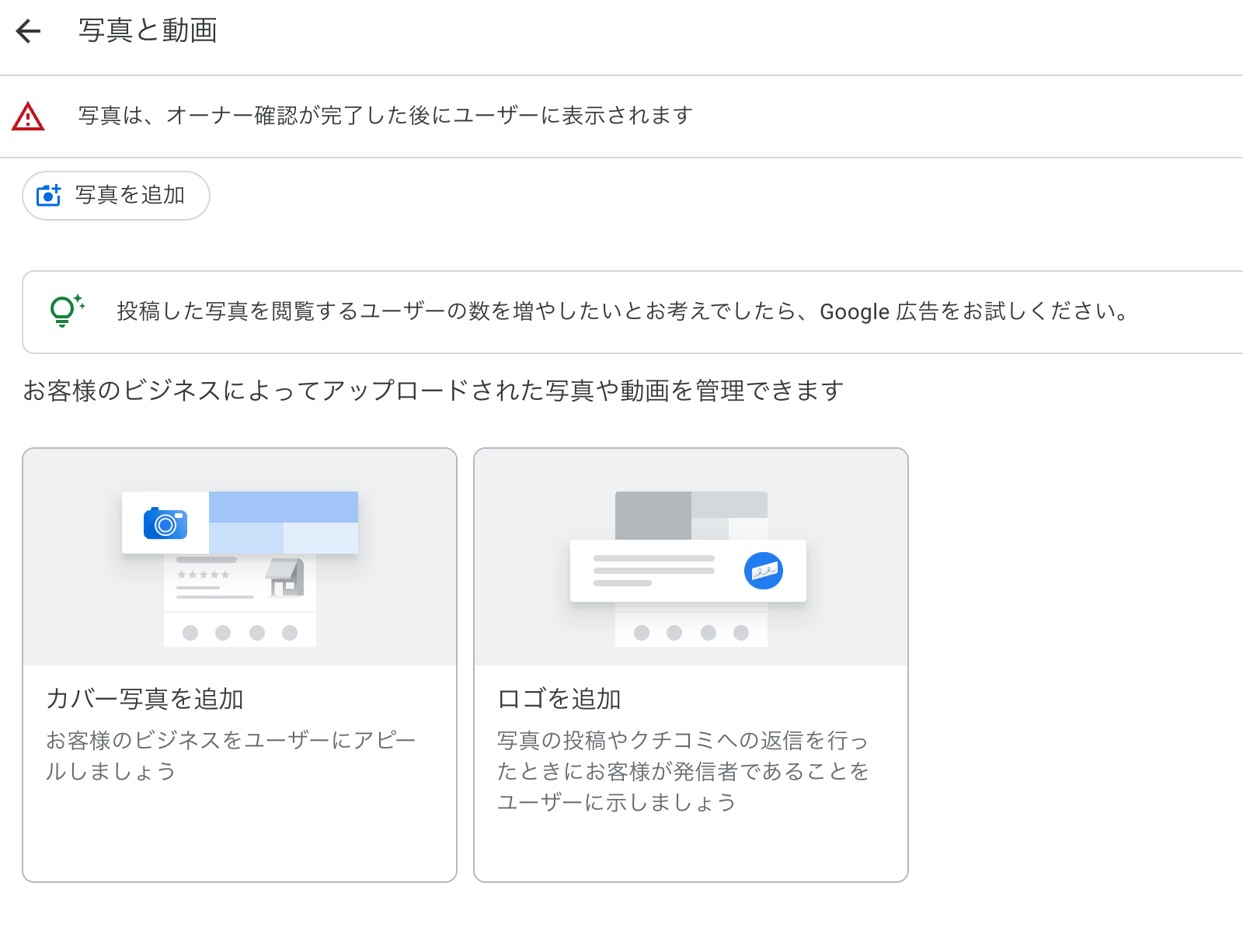 管理画面上では「写真はオーナー確認後にユーザーへ表示される」と案内されていますが、登録した写真はGoogle側の確認プロセスにおいて参照されていると考えられます。