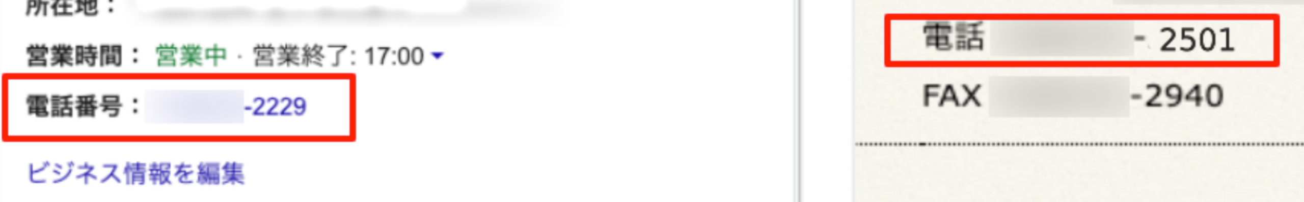 ビジネスプロフィールとウェブサイトのNAPが一致していない例