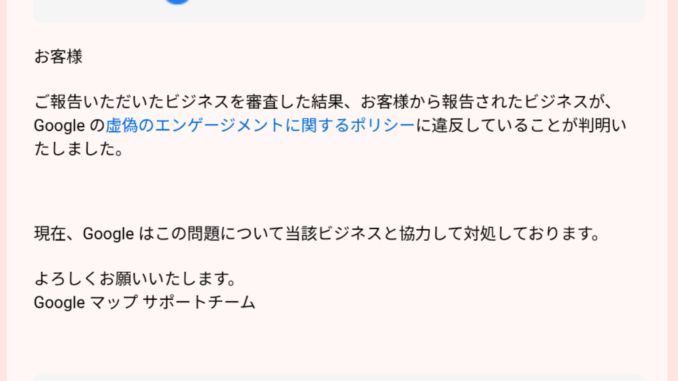 今回、情報提供いただいた方から違反行為をしていた対象店舗も教えていただいていますが、今のところビジネスプロフィールが停止されたりクチコミが非表示になったりしている様子はありません。