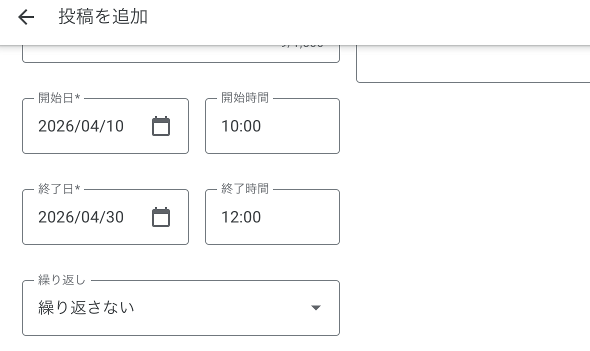 ビジネスプロフィールの投稿機能は今までは即時投稿しかありませんでしたが、以前「投稿のスケジュール送信機能」が搭載されました。今回はさらに機能が拡充され、特典とイベント投稿に限り「繰り返し投稿」が利用できるようになりました。