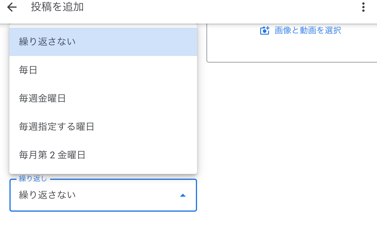 「繰り返し」を選択すると繰り返しタイミングが選択できるようになりますが、選択できるタイミングは下記の通りです。