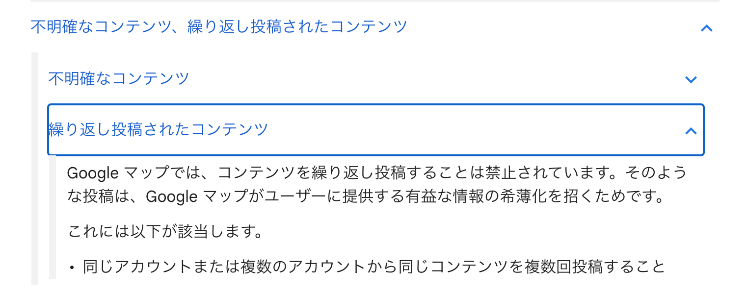 「繰り返し投稿」における懸念点としては、コンテンツの重複があります。マップユーザーの投稿コンテンツに関するポリシー ヘルプに記載されている禁止または制限されているコンテンツの中には、不明確なコンテンツ、繰り返し投稿されたコンテンツという項目があり、「同じアカウントまたは複数のアカウントから同じコンテンツを複数回投稿すること」が禁止されています。