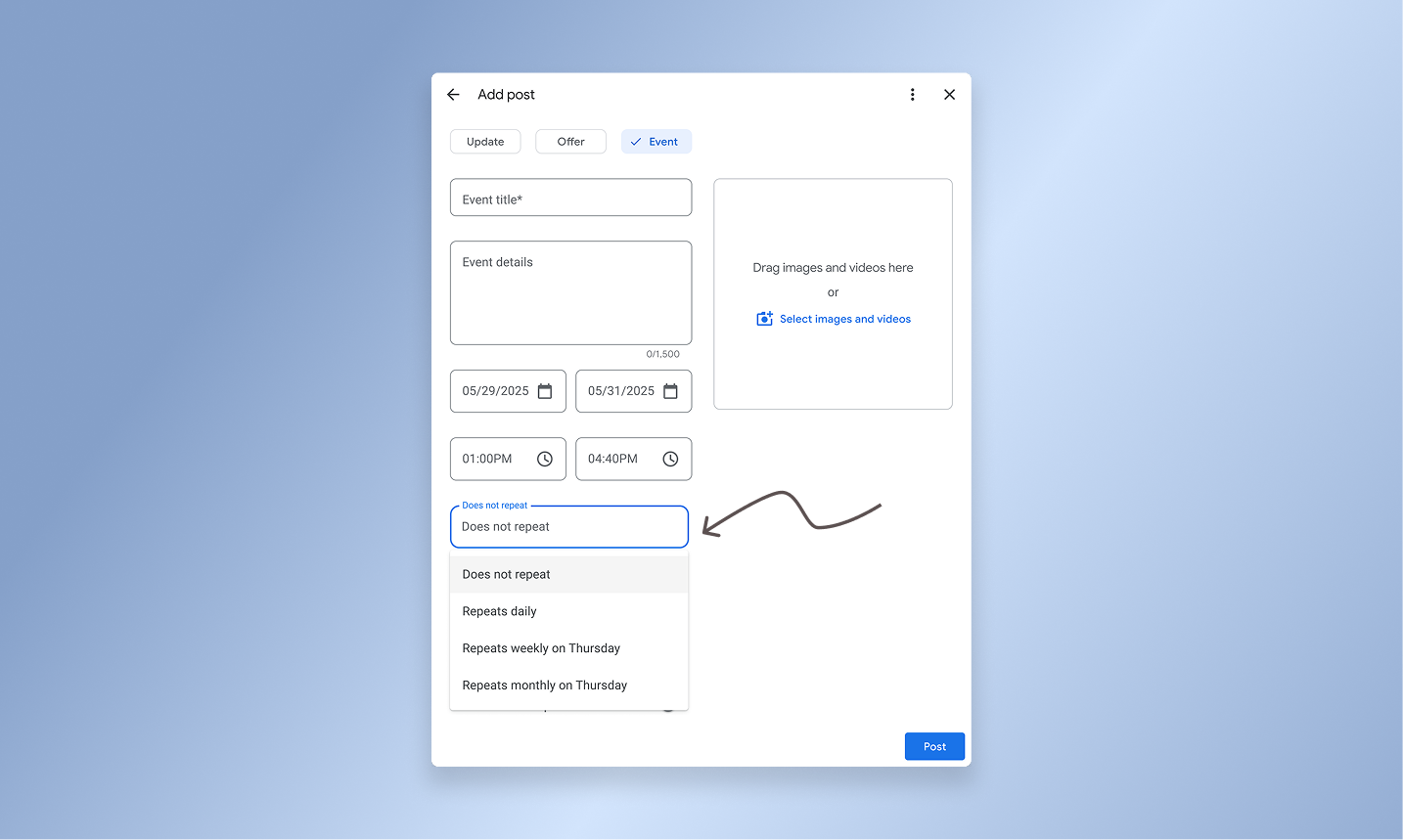 こちらが実際の操作画面ですが、特典またはイベント投稿を選択すると、「繰り返し」が表示されるようになり、繰り返しを行うタイミングを選択することができます。