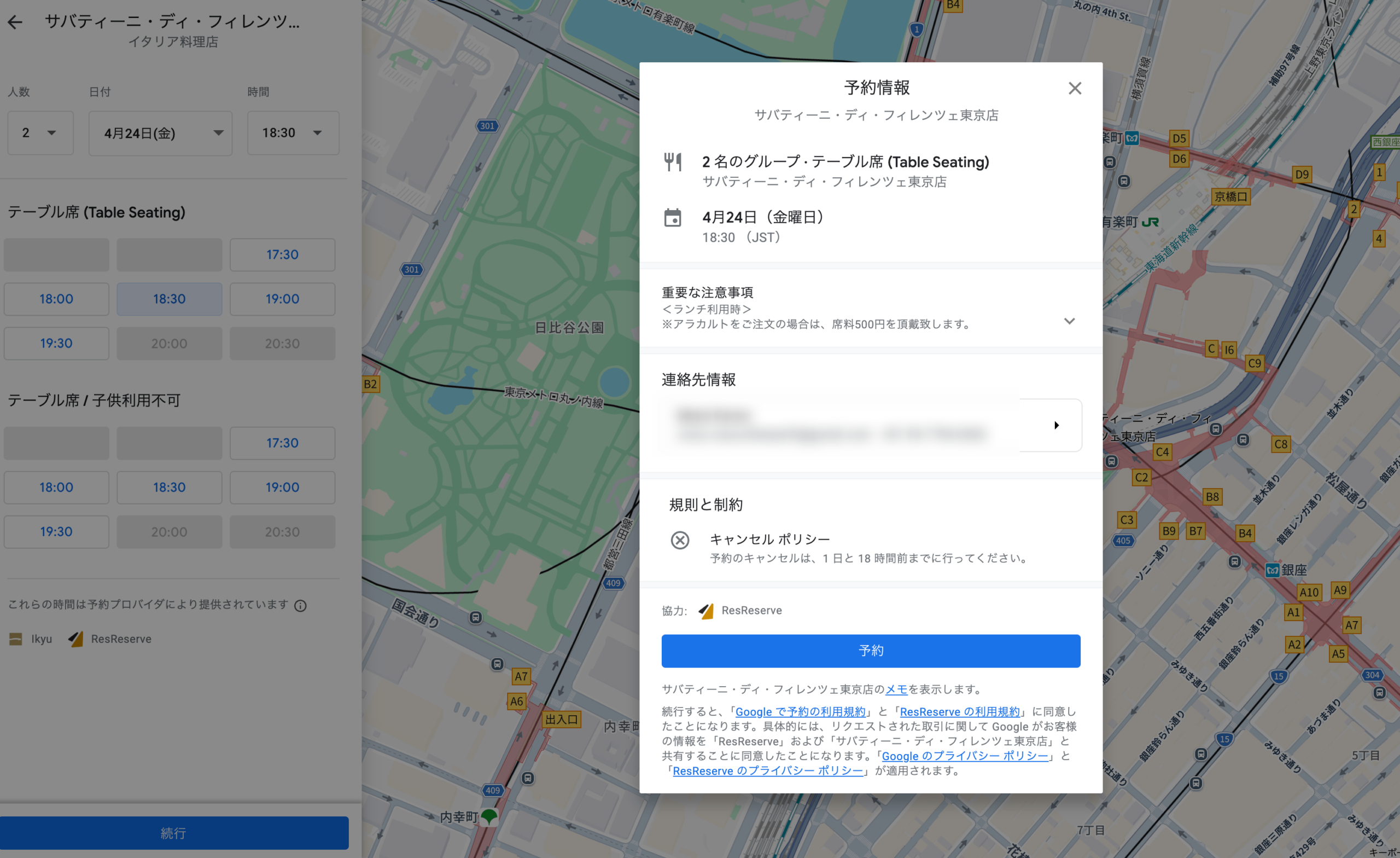 「Googleで予約」に対応しているお店であれば、人数、日付、時間の選択も含めてGoogleマップと会話を進める中で予約まで完了してしまうのは非常に利便性が高いです。