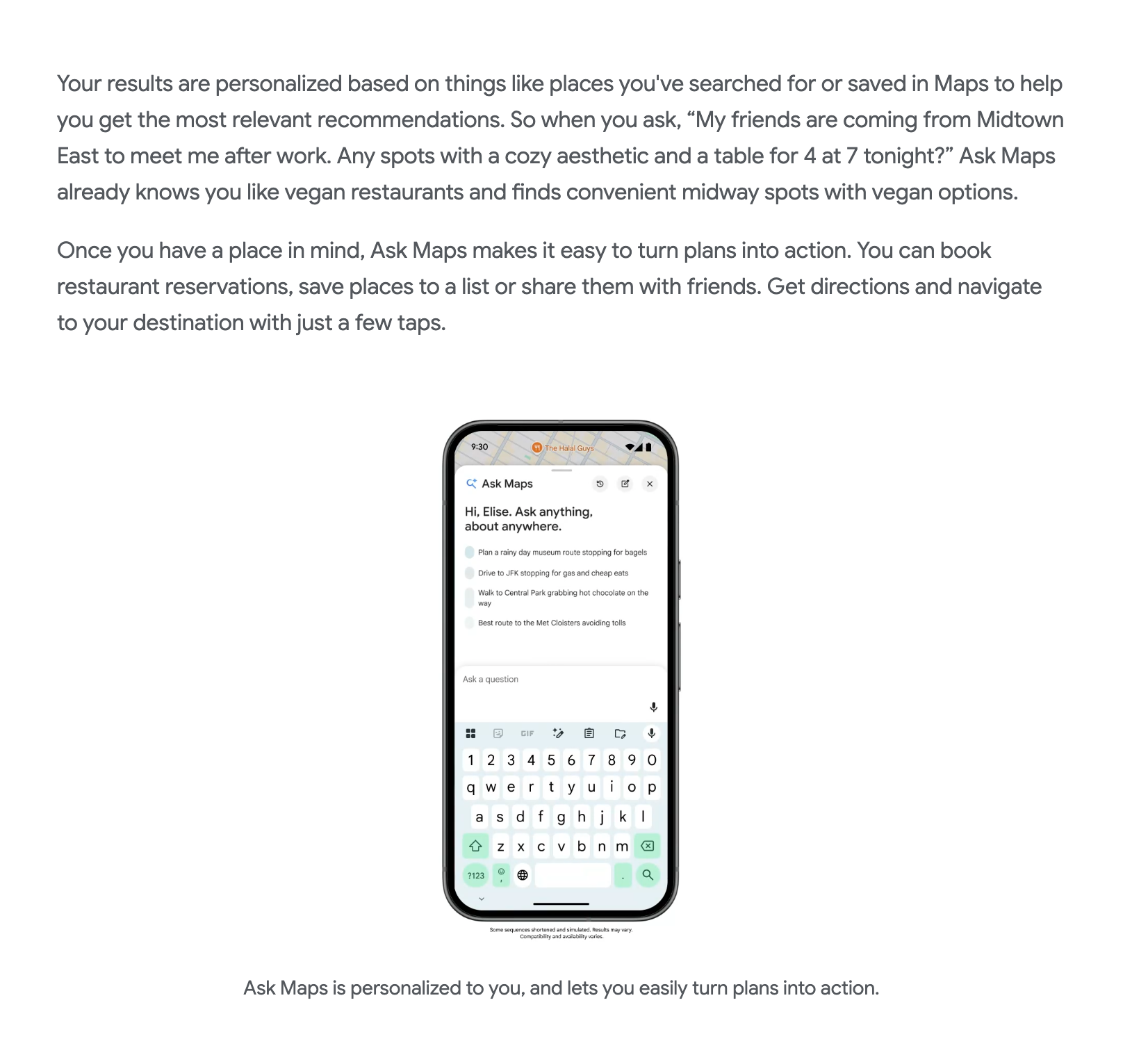 なお、Ask Mapsの検索結果はパーソナライズドされており、How we’re reimagining Maps with Gemini内において、GoogleはAsk Mapsの検索結果はマップで検索した場所、保存した場所などを元にパーソナライズドされていますと説明しています。