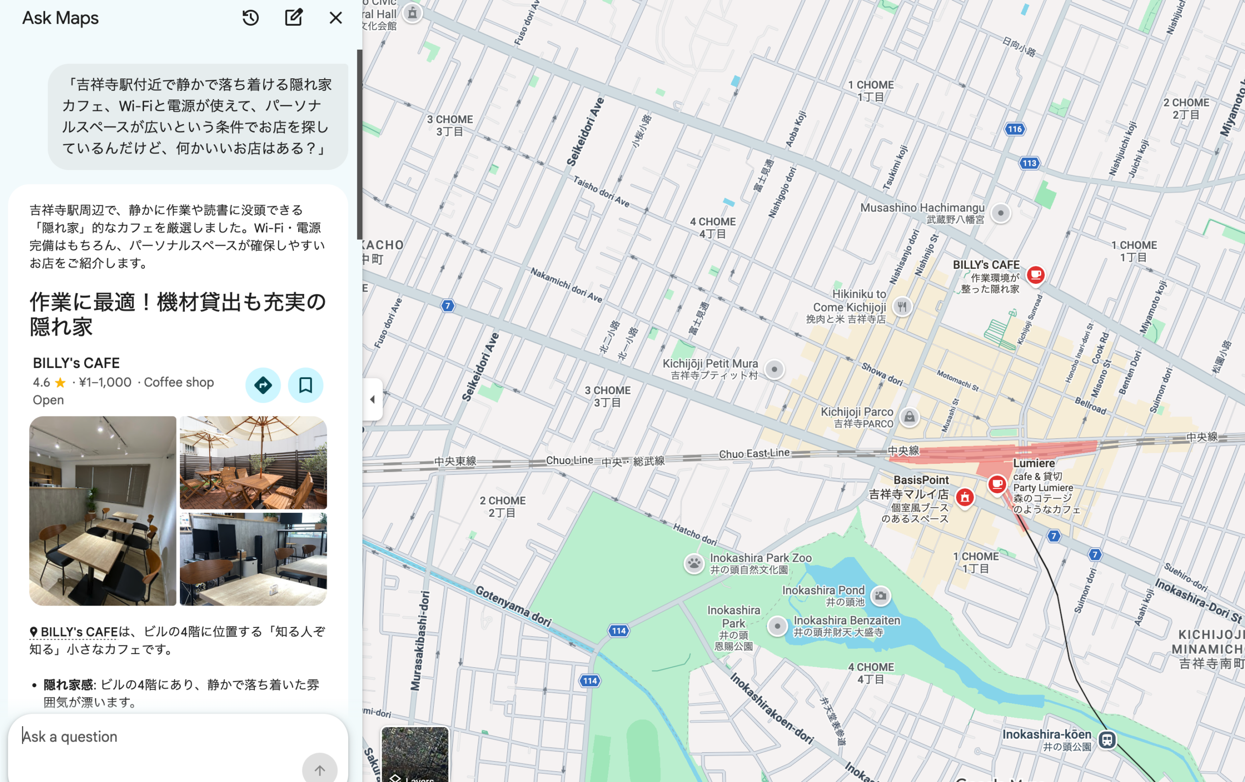 ざっくりどういった機能かということですが、Ask Mapsの機能名のままで「Googleマップに質問ができる」機能といえます。