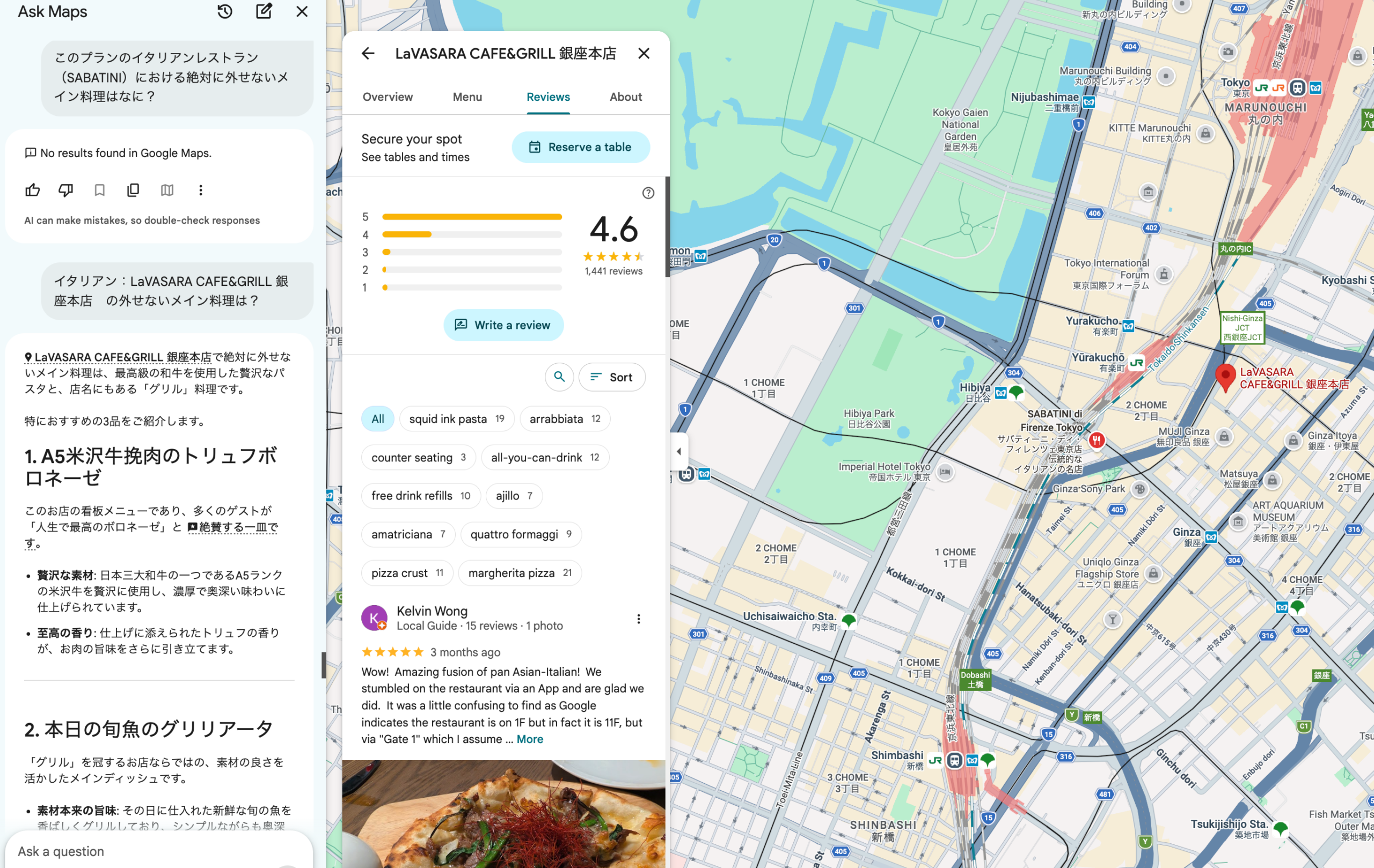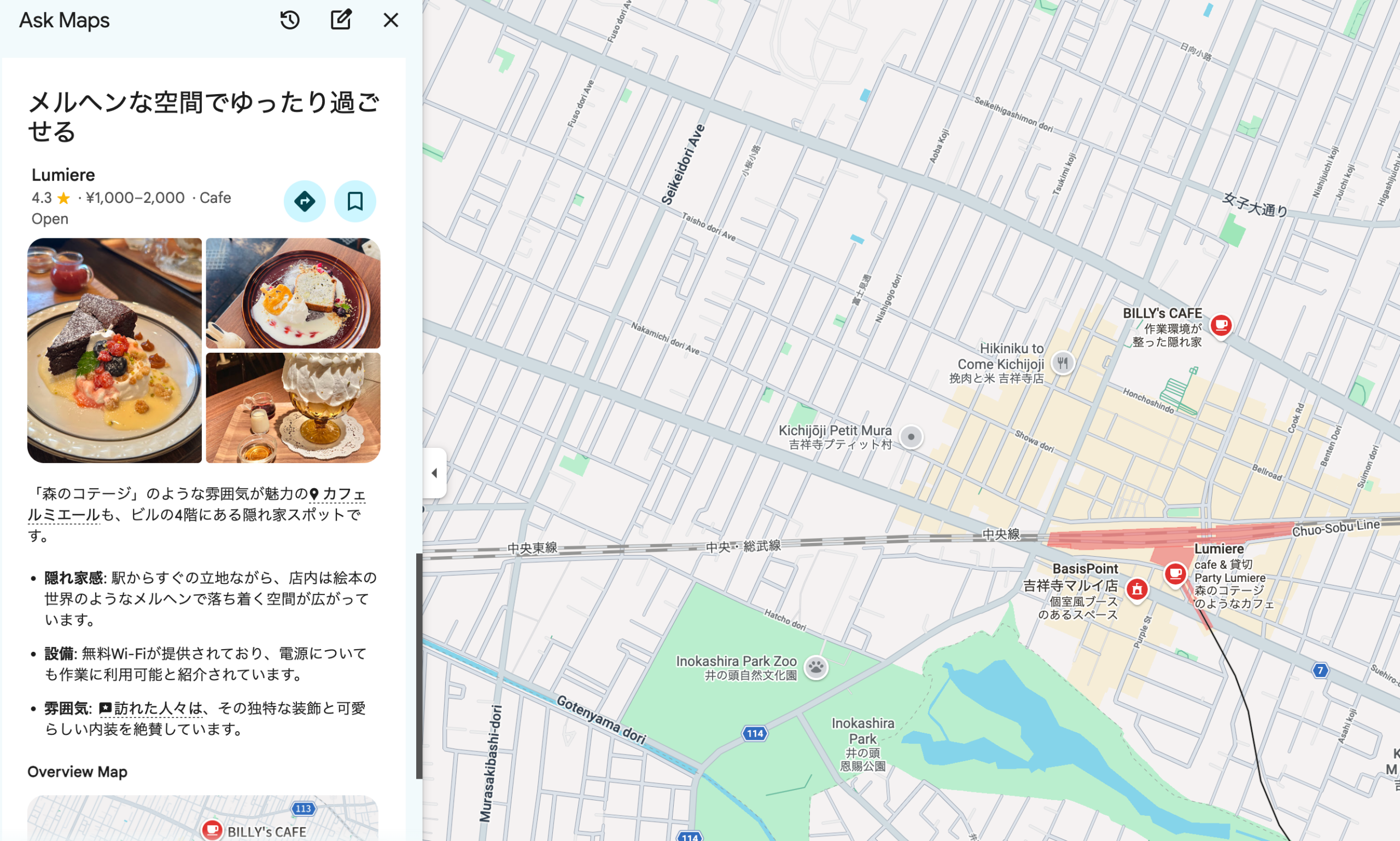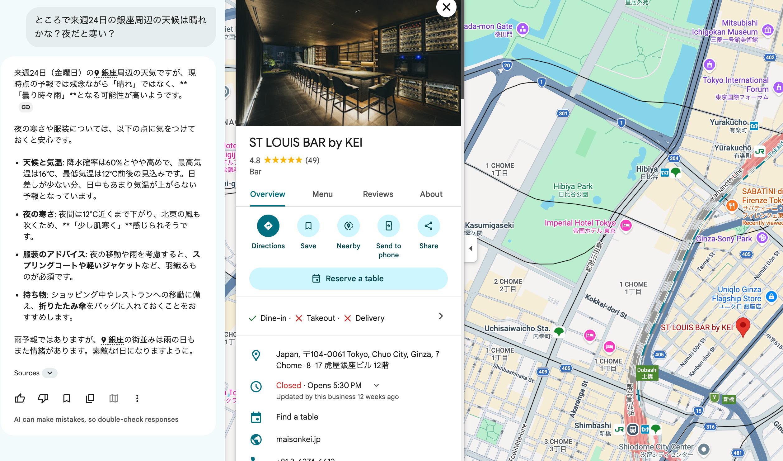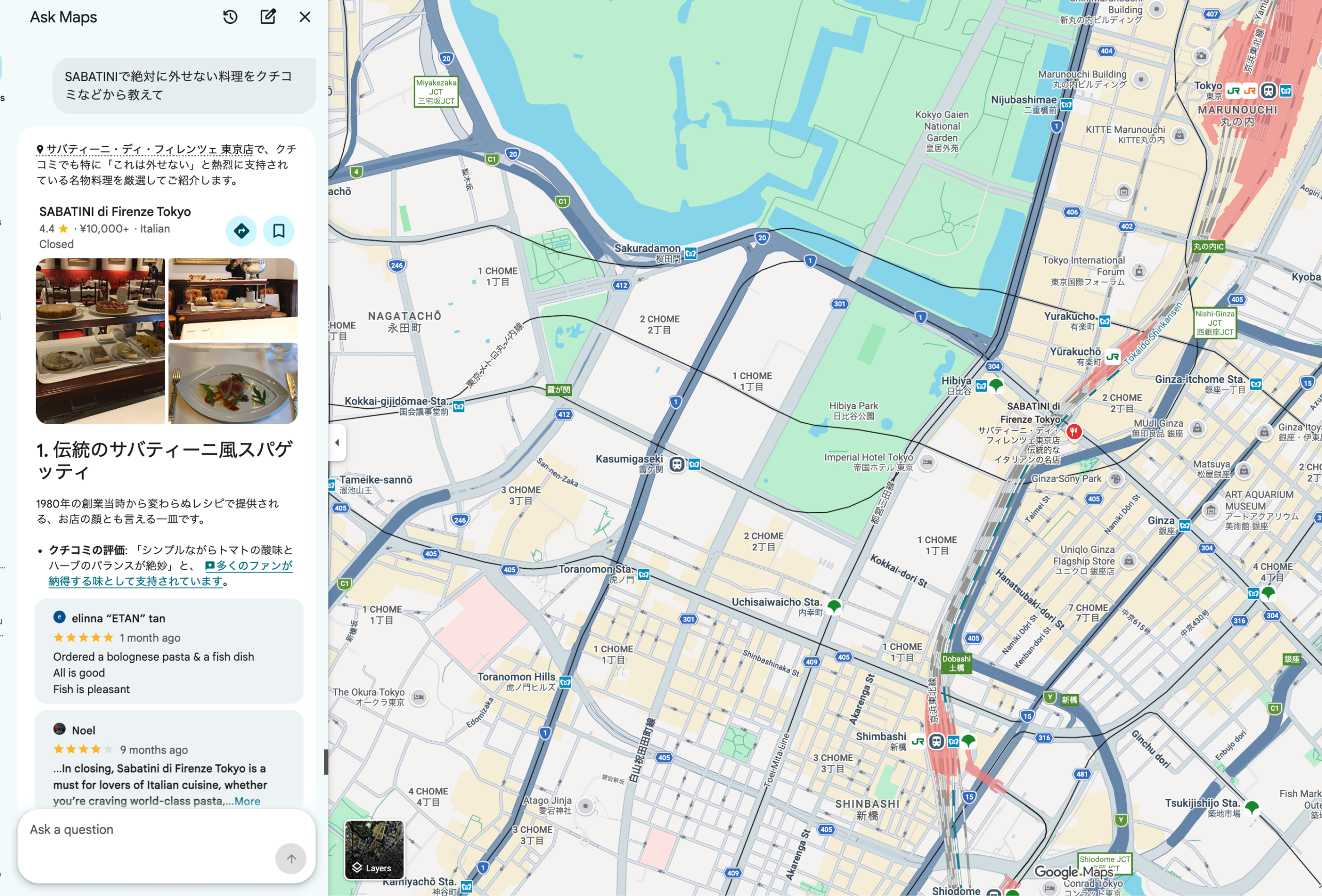 Ask MapsはGeminiがGoogleマップに搭載されたことで店舗の様々な情報が読み込まれ、ユーザーに提案される機能です。