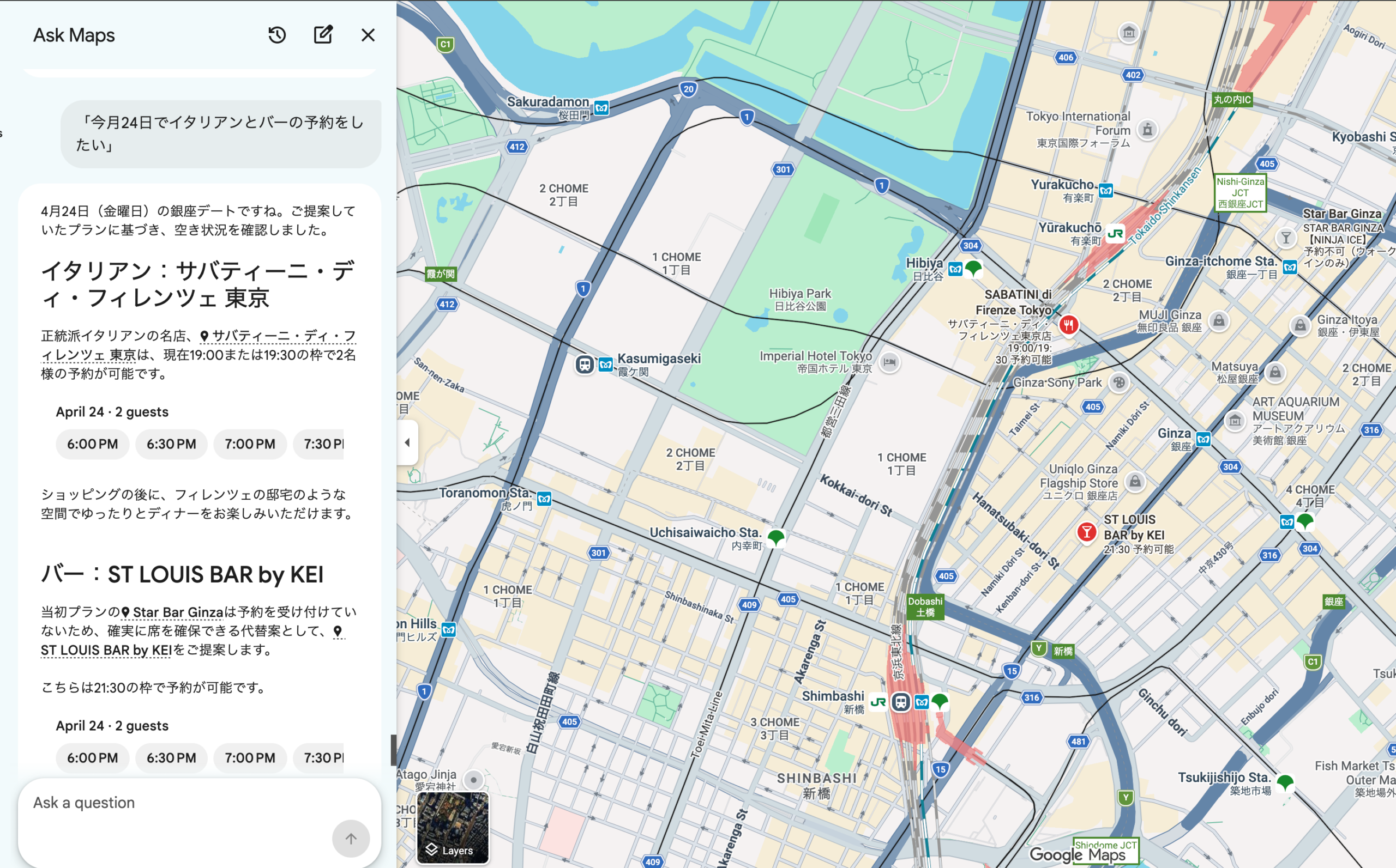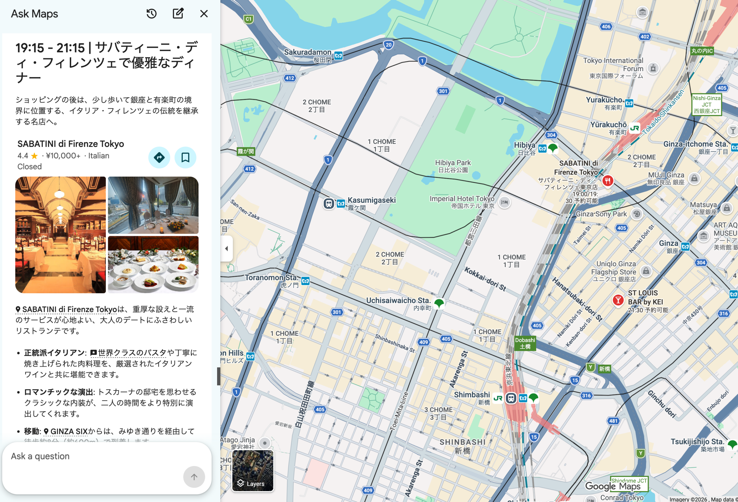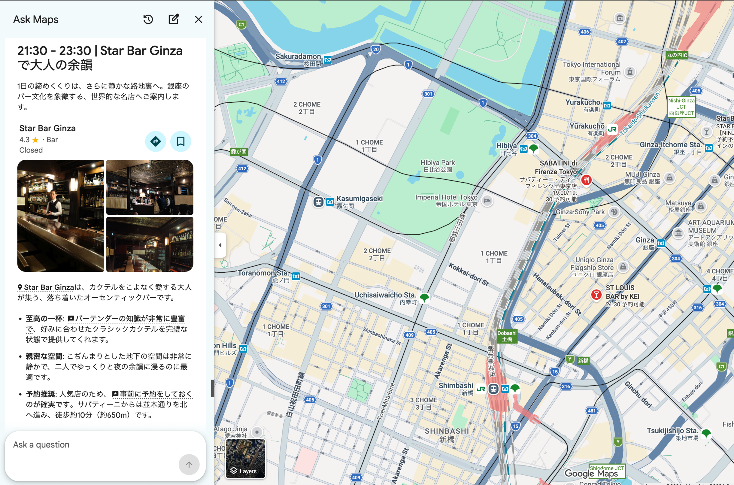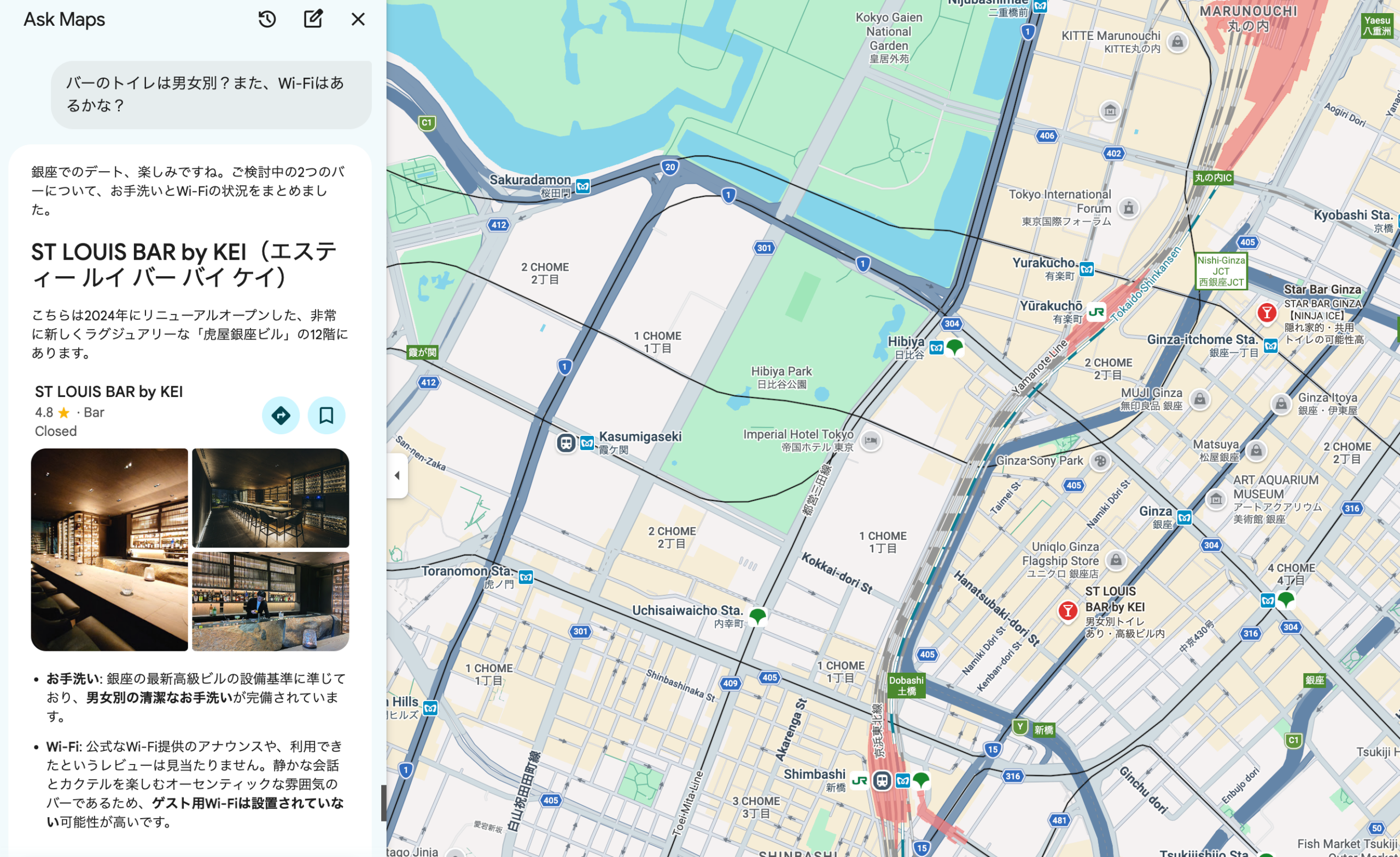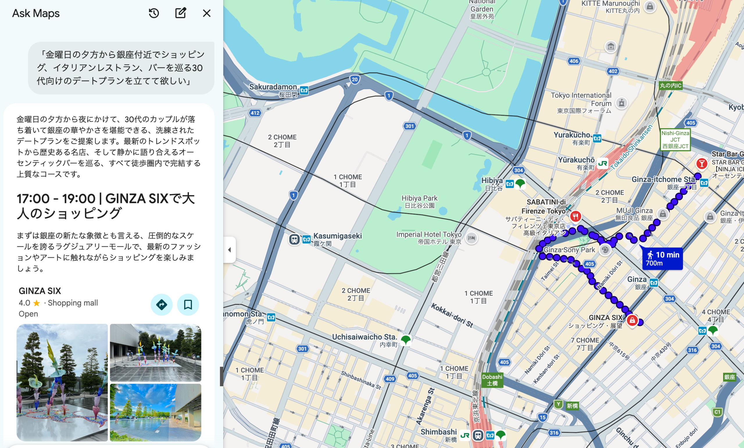 続いて銀座周辺でデートプランを立てている想定です。ショッピングを楽しみレストランで食事、食事後は少しバーでゆったりしたいというニーズを入れて、Googleマップにデートプランを提案してもらっています。