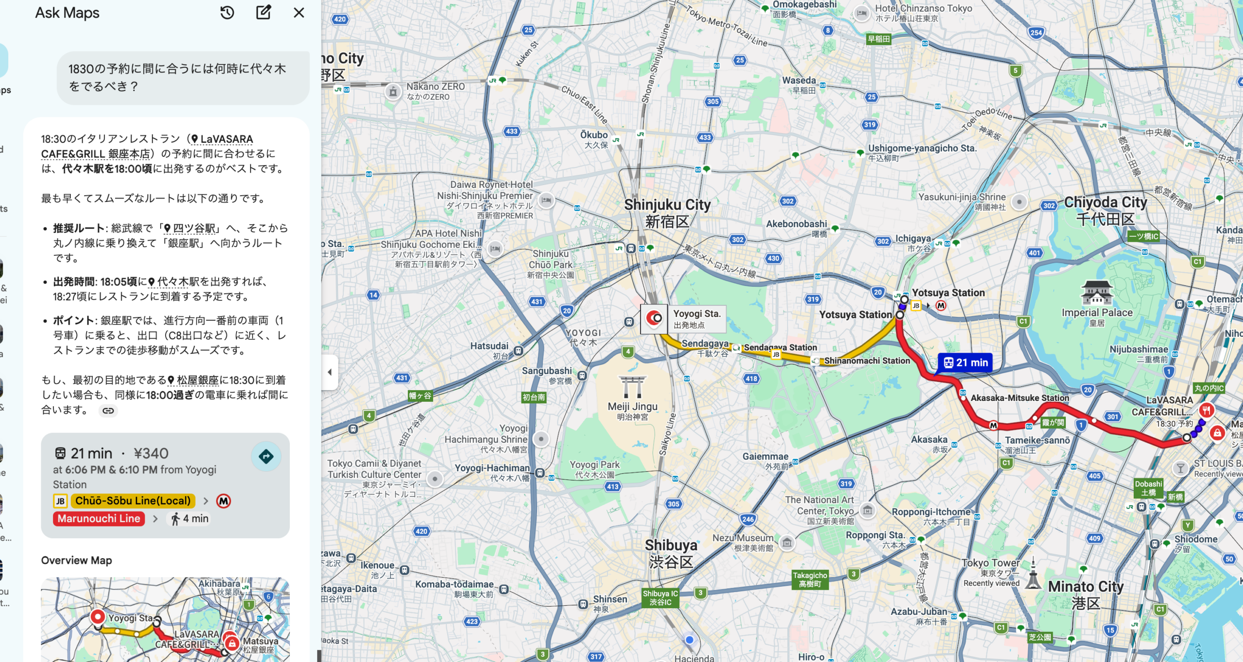 Googleマップに搭載されている機能になりますので、当然ながら「現在地から」「代々木駅から」「18:30の予約に間に合うには?」など、出発地点や時間を指定しても、しっかりと時間やルートを提案してくれます。