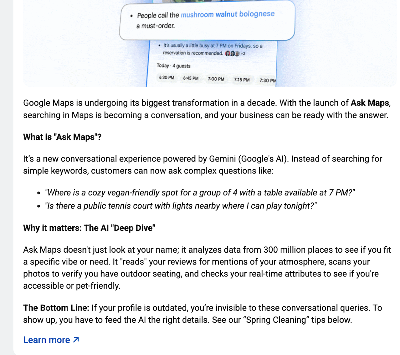 Googleビジネスプロフィールが発行しているニュースレターによると、Googleビジネスプロフィールの店舗情報、クチコミ、属性情報、写真等からもユーザーにオススメできるかが判断されているようですし、プロフィール内容が古い場合は会話形クエリには表示されないとされています。